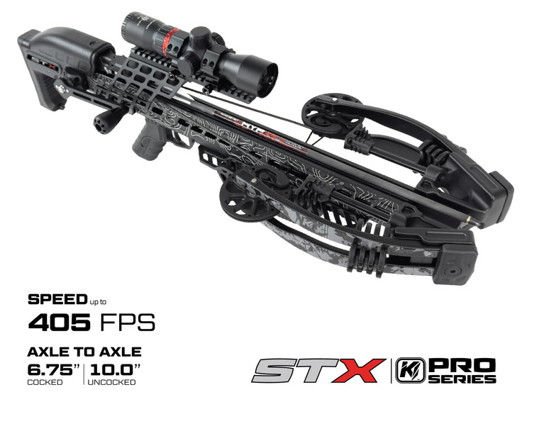 The STX package includes a Maxview™ Optics MV-36 Scope, (3) premium 20-inch, 390-grain Hypr-V™ bolts with the new V-Track nock, a three-arrow low-profile quiver, and rail lube.